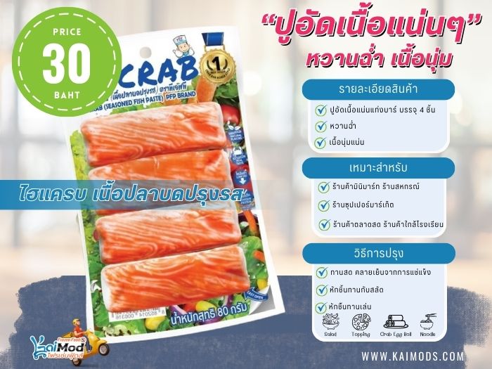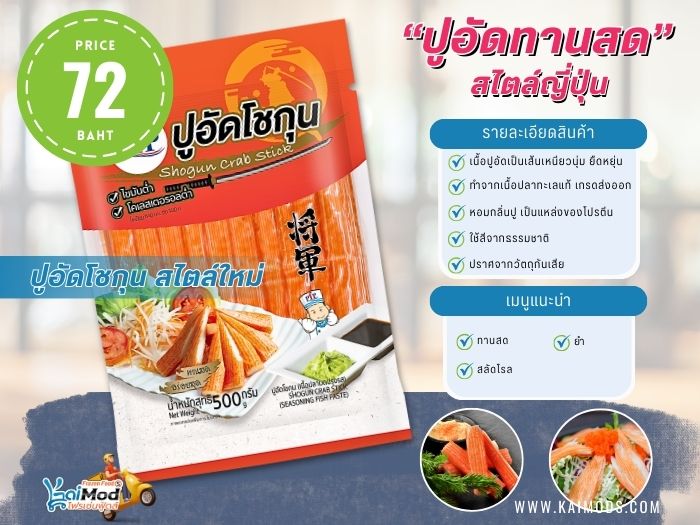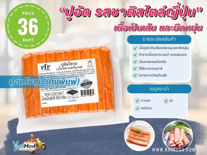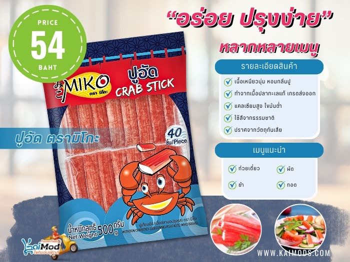 Kaimods Frozen Food จำหน่ายปูอัดราคาส่ง และราคาปลีก เรามีปูอัดรูปแบบต่างๆ มากมาย รวบรวมมาเพื่อให้ลูกค้าได้เลือกสรร นำไปประกอบอาหารภายในครอบครัว หรือนำไปทำอาหารจำหน่าย รวมถึงร้านค้าร้านอาหาร ร้านชาบู หมูกระทะ ได้ใช้เป็นวัตถุยอดนิยมประจำร้านด้วยเช่นกัน โดยทางร้านมีปูอัดหลายแบรนด์ให้เลือก เช่น TVI, PFP, คานิวัน, กาก้า, มิกิ, Hi-Crab, Miko ฯลฯ เป็นต้น. เรามีบริการจัดส่งทั่วประเทศ ด้วยรถขนส่งควบคุมอุณหภูมิ เพื่อรักษาคุณภาพสินค้าของเราให้สดจนถึงมือลูกค้า